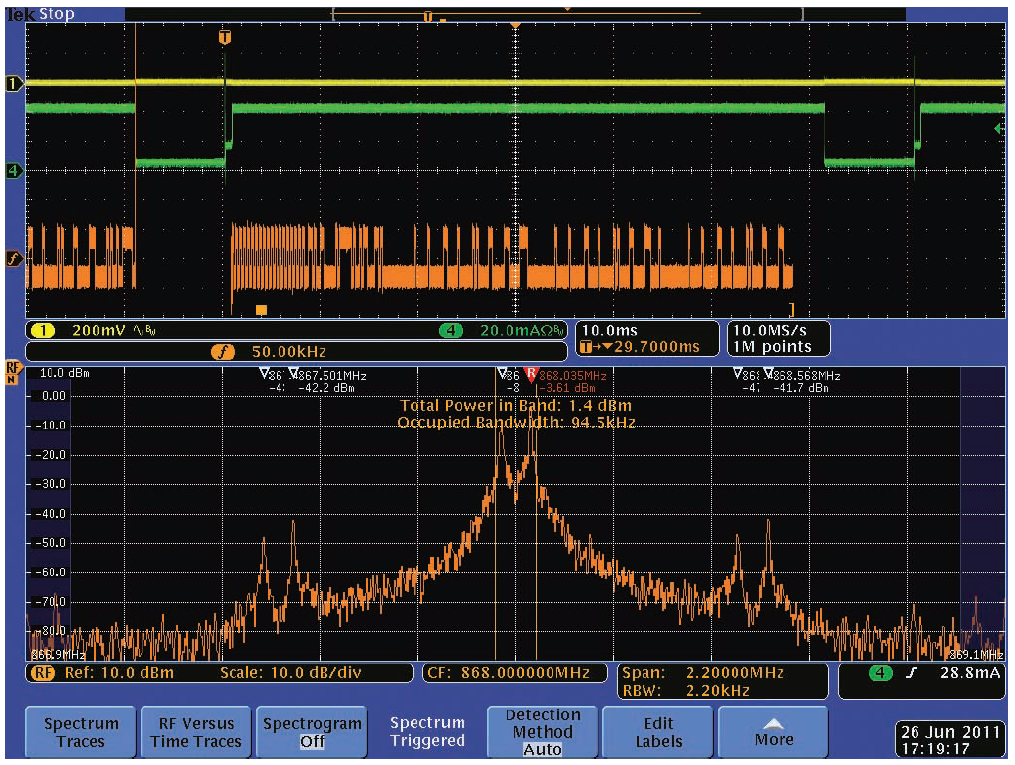 我們測(cè)量以868 MHz為中心的無線電頻譜,其擁有相當(dāng)?shù)偷? kbps的FSK調(diào)制數(shù)據(jù)速率,以供參考。圖2顯示了參考頻譜。注意MDO同時(shí)顯示時(shí)域視圖和頻域視圖,所有信號(hào)都時(shí)間相關(guān)。[page]