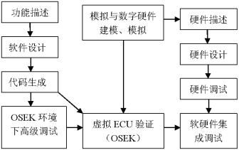 汽車(chē)電子產(chǎn)品是軟硬件結(jié)合的嵌入式系統(tǒng)。為了節(jié)約資源,縮短產(chǎn)品開(kāi)發(fā)周期,一般應(yīng)采取軟硬件同步開(kāi)發(fā)的方案。汽車(chē)電子產(chǎn)品的開(kāi)發(fā)工具對(duì)軟硬件的同步開(kāi)發(fā)、調(diào)試提供了很好的支持。汽車(chē)電子產(chǎn)品的軟件開(kāi)發(fā)分為功能描述、軟件設(shè)計(jì)、代碼生成、操作系統(tǒng)環(huán)境下高級(jí)調(diào)試等步驟。汽車(chē)電子產(chǎn)品的硬件開(kāi)發(fā)分為硬件描述、硬件設(shè)計(jì)、硬件調(diào)試等步驟。當(dāng)軟件設(shè)計(jì)完成后,通過(guò)使用相應(yīng)的工具,完成在虛擬ECU平臺(tái)上的驗(yàn)證。當(dāng)硬件設(shè)計(jì)完成后,與硬件一起進(jìn)行軟硬件集成調(diào)試。通過(guò)這種開(kāi)發(fā)方式,縮短了產(chǎn)品上市的時(shí)間。