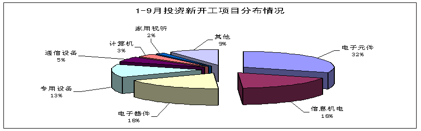 前三季度,電子信息產(chǎn)業(yè)500萬元以上項目完成固定資產(chǎn)投資6492億元,投資額超過去年全年水平近500億元,同比增長62.4%,增速高于工業(yè)投資35.9個百分點。其中9月份完成投資889.6億元,同比增長35.6%,增速比8月下降35.2個百分點,這是今年以來第二個月月度投資增速低于60%。