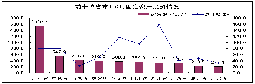 前三季度,東部10省市完成投資3825億元,同比增長74.9%,增速高于去年同期26.3個百分點;江蘇、廣東、浙江、北京投資上升較快,增速均超過80%,特別是江蘇省完成投資1546億元,占全國總投資的近四分之一。中部6省完成投資1557億元,同比增長60%,其中安徽、河南投資增長突出,分別居全國第四、五位,增長51.2%和116.4%。西部12省市完成投資836億元,同比增長53.5%,其中四川省投資359億元,占西部地區(qū)的43%,同比增長95.4%。東北三省完成投資274億元,同比下降6.2%。