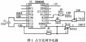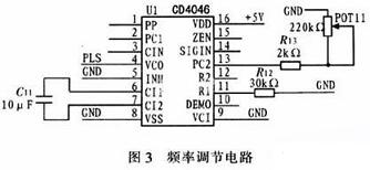 圖3為頻率調(diào)節(jié)電路。通過(guò)調(diào)節(jié)CD4046外接電位器POTll,控制VCO輸出脈沖的頻率,根據(jù)設(shè)計(jì)要求,該電路將輸出一個(gè)變化范圍在1~6 kHz之間的脈沖信號(hào)PLS,將該信號(hào)作為CPLD的輸入信號(hào)。在CPLD內(nèi)部通過(guò)計(jì)數(shù)延時(shí)和占空比設(shè)計(jì)要求,最終輸出一個(gè)頻率在400~3 000 Hz之間符合占空比要求的逆變觸發(fā)信號(hào),并可通過(guò)POT11調(diào)節(jié)該信號(hào)的頻率。