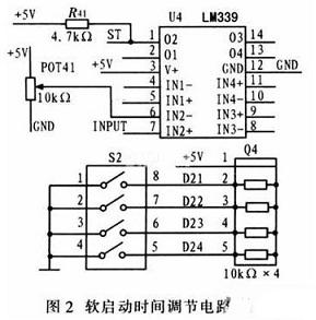 圖2為軟啟動(dòng)時(shí)間調(diào)節(jié)電路。該電路單元是將調(diào)節(jié)器輸出信號(hào)作為電壓比較器LM339的輸入信號(hào),此信號(hào)是一個(gè)在0~5 V之間變化的直流電壓信號(hào)(即INPUT信號(hào))。按照設(shè)計(jì)要求,LM339的引腳6給定電壓為1 V,當(dāng)INPUT信號(hào)的電壓大于l V時(shí),LM339的引腳l通過(guò)上拉電阻輸出一個(gè)高電平作為啟動(dòng)信號(hào)送入CPLD。在CPLD內(nèi)部通過(guò)調(diào)節(jié)外部的撥段開關(guān)控制比較器的輸出,從而控制軟啟動(dòng)的時(shí)間。