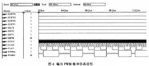 該系統(tǒng)軟件設(shè)計(jì)是根據(jù)系統(tǒng)功能要求而設(shè)計(jì)的,基于EPM7128的軟件程序設(shè)計(jì)分為:輸出脈沖占空比調(diào)節(jié)、頻率調(diào)節(jié)、軟啟動(dòng)時(shí)間調(diào)節(jié)和過(guò)壓過(guò)流報(bào)警。開發(fā)系統(tǒng)使用VHDL語(yǔ)言進(jìn)行模塊化編程,這樣可以提高程序的移植性,縮短開發(fā)周期,降低開發(fā)成本。而且易于維護(hù)系統(tǒng)軟件,提高可靠性。圖4是輸出的兩路PWM脈沖仿真波形,其中GCLK是一個(gè)基準(zhǔn)時(shí)鐘源,CLKl和CLK2分別是經(jīng)VCO轉(zhuǎn)換的頻率調(diào)節(jié)和占空比調(diào)節(jié)信號(hào),SET和SOFT分別是2個(gè)外接的4位占空比調(diào)節(jié)和軟啟動(dòng)調(diào)節(jié)撥段開關(guān)。