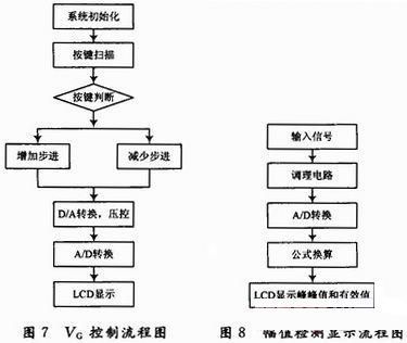 MSP430系列單片機(jī)是美國德州儀器(TI)1996年開始推向市場的一種16位超低功耗的混合處理器(Mixed Signal Processor)。由于它具有極低的功耗、豐富的片內(nèi)外設(shè)和方便靈活的開發(fā)手段,已成為眾多單片機(jī)系列中一顆耀眼的新星。對于MSP430系列而言,由于引進(jìn)了FLASH型程序存儲器和JTAG技術(shù),不僅使開發(fā)工具變得簡便,而且價(jià)格也相對低廉,并且還可以實(shí)現(xiàn)在線編程。程序采用C語言開發(fā)。VCA810的VG控制以及輸出電壓幅值檢測、顯示的流程圖如圖7、圖8所示。