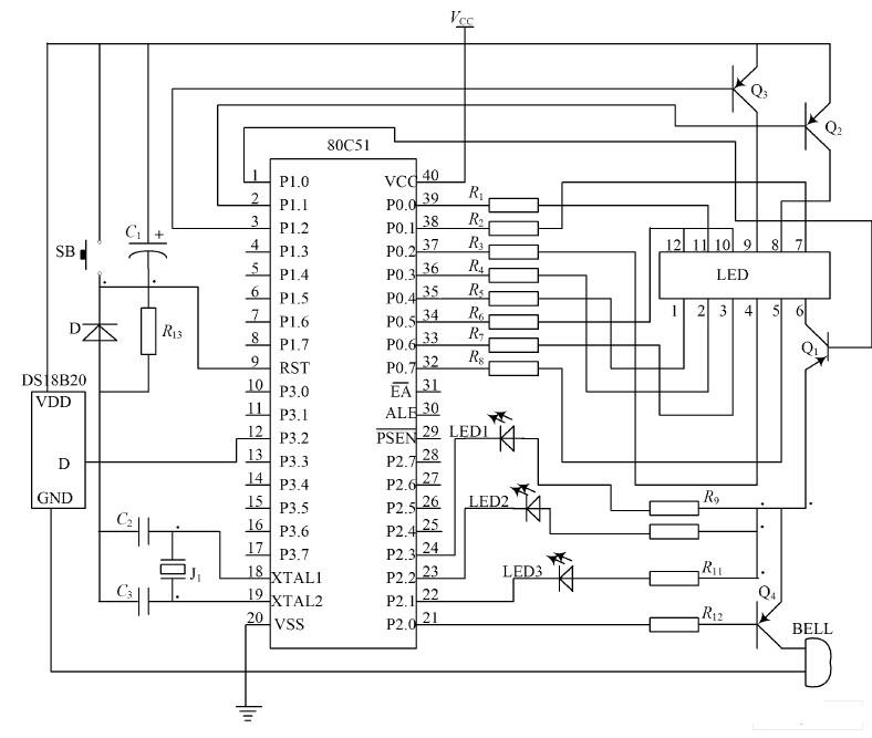 包括信號采集、系統(tǒng)控制、數(shù)字顯示、高溫報警四個部分。傳感器DS18B20 為信號采集器件所采集到的溫度信號,通過內(nèi)部處理由傳感器的DQ 端送到單片機P3. 2 端口,經(jīng)單片機的計算處理后,由P0 口和P1 口分別作為4 位共陽數(shù)碼管的段控信號和位控信號,共同完成對所測溫度值的數(shù)字顯示,最高位是符號顯示,如顯示負號“-”時,表示當前溫度是負溫度,否則為正溫度;由P2. 0 端口控制蜂鳴器,當測量的溫度超過“預設報警溫度”時,發(fā)出提示音報警; P2. 1~ P2. 3 端口來控制黃、綠、紅3 個發(fā)光二極管分別表示低溫、正常、高溫三種溫度狀態(tài)。石英晶體JT 和電容C2 ,C3 共同組成晶振電路; 電容C1 、電阻R 13、S B 共同構成復位電路; 其中電阻R13為下拉電阻,SB 為手動復位按鈕。