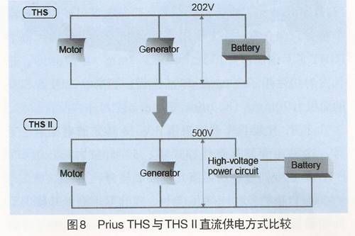 在THS中,蓄電池通過(guò)逆變器直接與電機(jī)和發(fā)電機(jī)相連(見(jiàn)圖8);而THSⅡ中,蓄電池組輸出的電壓首先通過(guò)DC—DC升壓變換器進(jìn)行升壓操作,然后再與逆變器相連,因此逆變器的直流母線電壓從原THS的220V提升為現(xiàn)在的500V。