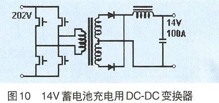 通常汽車(chē)中各種用電設(shè)備由14V蓄電池組供電(額定電壓為12V),Prius也選用了14V蓄電池組作為諸如控制計(jì)算機(jī)、車(chē)燈、制動(dòng)器等車(chē)載電氣設(shè)備的供電電源,而對(duì)該蓄電池的充電工作則由直流220V通過(guò)DC—DC降壓變換器來(lái)完成的,變換器的電路圖如圖10所示。變換器的容量為 1.4kW(100A/14V),功率器件選用壓控型商用MOSFET(500V/20A),每個(gè)MOSFET芯片的面積為49mm2(7mm× 7mm)。