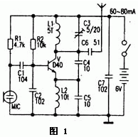 圖1是較為經(jīng)典的1.5km單管調頻發(fā)射機電路。電路中的關鍵元件是發(fā)射三極管,多采用D40,D5O,2N3866等。工作電流為60--80mA。但以上三極管難以購到,且價格較高,假貨較多。筆者選用其他三極管實驗,相對易購的三極管C2053和C1970是相當不錯的,實際視距通信距離大于1.5km。筆者也曾將D40管換成普通三極管8050,工作電流有60--80mA,但發(fā)射距離達不到1.5km,若改換成9018等,工作電流更小,發(fā)射距離也更短,電路中除了發(fā)射三極管以外;線圈L1和電容C3的參數(shù)選擇較重要,若選擇不當會不起振或工作頻率超出88--108MHz范圍。其中L1,L2可用0.31mm的漆包線在3.5mm左右的圓棒上單層平繞5匝及10匝,C3選用5-20pF的瓷介或滌綸可調電容。實際制作時,電容C5可省略,L2上也可換成10-100mH的普通電感線圈。若發(fā)射距離只要幾十米,那么可將電池電壓選擇為1.5-3V,并將D40管換成廉價的9018等,耗電會更少,也可參考《電子報》2000年第8期第五版(簡易遠距離無線調頻傳聲器)一文后稍作改動。圖1介紹的單管發(fā)射機具有電路簡單,輸出功率大,制作容易的特點,但是不便接高頻電纜將射頻信號送至室外的發(fā)射天線,一般是將0.7--0.9m的拉桿天線直接連在C5上作發(fā)射的,由于多普勒效應,人在天線附近移動時,頻漂現(xiàn)象很嚴重,使本來收音正常的接收機聲音失真或無聲。若將本發(fā)射機作無線話筒使用,手捏天線時,頻漂有多嚴重就可想而知了。
