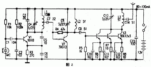 圖2為2km調頻發(fā)射機電路。本電路分為振蕩、倍頻、功率放大三級。電路中V1、C2--C6、R2、R3及L1組成電容三點式振蕩器,其振蕩頻率主要由C3、C4和L1的參數(shù)決定,其振蕩頻率為44~54MHz,該信號從L1的中心抽頭處輸出,再經(jīng)過C7耦合至V2放大,由C8和L2選出44~54MHz的二倍頻信號,即88-108MHz,,此信號由C9耦合至V3進行功率放大,V3由3只3DGl2三極管并聯(lián)組成,可擴大輸出功率。該電路正常工作時,電流約80-100mA。組成V3的三只3DG12可加上適當?shù)纳崞苑肋^熱。制作時L1~L3用0.31mm漆包線在直徑3.5mm圓棒上單層平繞。