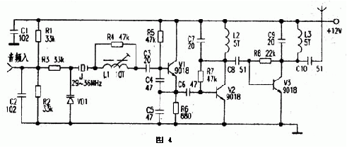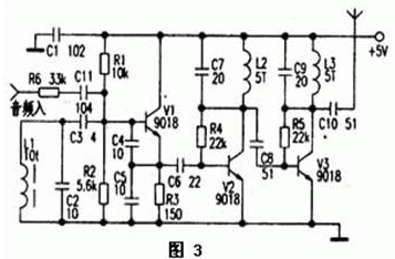 圖4為晶振式發(fā)射機電路。電路中J.、VD1、L1、C3~C5、V1組成晶體振蕩電路。由于石英晶體J的頻率穩(wěn)定性好,受溫度影響也較小,所以廣泛用于無繩電話及AV調制器中。Vl是29~36MHz晶體振蕩三極管,發(fā)射極輸出含有豐富的諧波成分,經(jīng)V2放大后,在集電極由C7、L2構成諧振于88-108MHz的網(wǎng)絡選出3倍頻信號(即87~108MHz的信號最強),再經(jīng)V3放大;L3、C9選頻后得到較理想的調頻頻段信號。頻率調制的過程是這樣的,音頻電壓的變化引起VD1極間電容的變化;由于VD1與晶體J串聯(lián),晶體的振藩頻率也發(fā)生微小的變化,經(jīng)三倍頻后,頻偏是29-36MHz晶體頻偏的3倍。實際應用時,為獲得合適的調制度,可選擇調制頻偏較大的石英晶體或陶瓷振子,也可以采用電路稍復雜的6-12倍頻電路。若輸入的音頻信號較弱;可加上一級電壓放大電路。