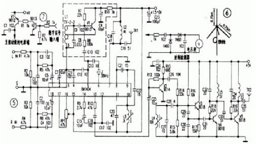 很多調頻立體聲模塊均將BAl404和外圍元件封裝在一個塑料或金屬外殼內制成,只露出電源輸入、音頻輸入、射頻輸出引線,只要了解BAl404以后,就知道調頻立體聲模塊內部是怎么一回事了。來自音源的立體聲音頻信號經(jīng)R1、R2、R5、C1、C3、C5(R4、R3、R6、C2、C4、C6)組成的網(wǎng)絡耦合到BAl404。經(jīng)IC內部左(右)聲道放大,再進行平衡調制,調制后的復合信號從IC的第14腳輸出,后與第13腳上的導頻信號通過B9、C15,B10、C16、C17構成的網(wǎng)絡進行混頻,混頻后的復合信號進入IC的12腳,對比的⑧、⑨、⑩腳,C20--C22及髓組成的電容三點式振蕩器進行調頻,IC的⑩腳上已調制的射頻信號經(jīng)內部放大后從第⑦腳輸出,經(jīng)C18、L2選頻后送至天線TXl。要實現(xiàn)調頻立體聲,BAl404的⑤、⑥腳需外接38kHz晶體,但業(yè)余制作時的確很難購得38kHz的專用晶體,所以在無該晶體的情況下,可以參考虛線內的電路,用分立元件制作一個38kHz振蕩器,該38kHz信號經(jīng)過R8、C10送人IC第⑤腳。制作時,Ll可用收音機中頻變壓器ITF—2—1、TTF-2-2或TFF-2-9等,同時注意引腳的連接不要搞錯,③腳接地,②腳接V1的發(fā)射極,①腳為反饋和輸出腳。通過調整其磁芯可以獲得頻率較穩(wěn)定、幅度足夠高的38kHz信號。