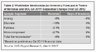 據(jù)IHS iSuppli公司的庫存研究報告,對于半導(dǎo)體的需求下降,在2011年第四季度加劇了半導(dǎo)體產(chǎn)業(yè)庫存過剩局面,并帶來一系列令人不快的變化,但在看到新的樂觀跡象之后,半導(dǎo)體廠商急于忘掉不快,希望這是低迷階段的尾聲。