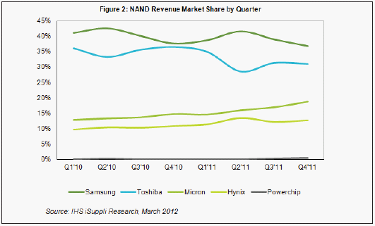 在材料方面,晶圓供應(yīng)商在一個(gè)月后就快速恢復(fù)了生產(chǎn),并提高了其它地點(diǎn)的產(chǎn)量,使其主要客戶面臨的供應(yīng)短缺問題降低最小。中期來看,這場災(zāi)害實(shí)際上導(dǎo)致NAND市場更加接近供需平衡,幫助該產(chǎn)業(yè)的營業(yè)收入在2011年第三季度環(huán)比增長10.0%,而2010年第三季度是環(huán)比增長9.1%。