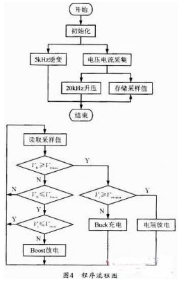 按照上述控制策略,得到如圖4的程序流程圖,其中5kHz逆變?yōu)榫鶋弘娐分械哪孀兤?,采?0%的PWM脈沖波來實(shí)現(xiàn),不需要復(fù)雜的控制算法。20kHz升壓模塊完成開關(guān)管S1信號的產(chǎn)生。需要通過電壓采集電路,得到串聯(lián)電容的總電壓。4個判斷模塊通過判斷Vdc和Vc的電壓范圍決定對電容的充放電控制。