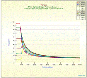 像上圖一樣的繪出一個(gè)電機(jī)的轉(zhuǎn)矩——轉(zhuǎn)速曲線并非輕而易舉之事,需要每個(gè)轉(zhuǎn)速下優(yōu)化超前角來得到。MotorSolve可以快速設(shè)置多種轉(zhuǎn)速和超前角的組合方式,來繪制上述圖形。通過這些曲線的包絡(luò)線,能得到轉(zhuǎn)矩——轉(zhuǎn)速曲線和優(yōu)化的超前角。恒功率變速內(nèi)嵌磁鋼式永磁電機(jī)的曲線如上圖所示。