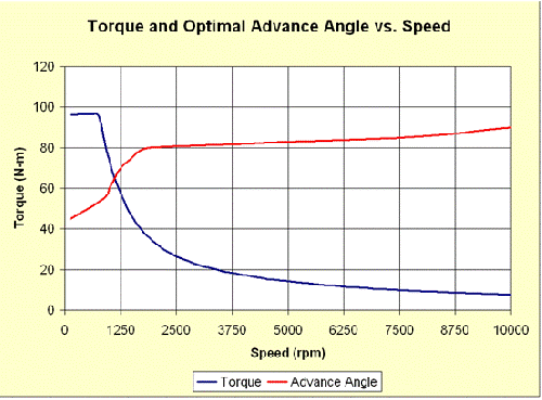 這幅圖中可以提取每個(gè)轉(zhuǎn)速下優(yōu)化超前角的峰值轉(zhuǎn)矩。當(dāng)電機(jī)超過恒轉(zhuǎn)矩區(qū)域(大概875轉(zhuǎn)/分)后,弱磁的優(yōu)勢突顯出來。
