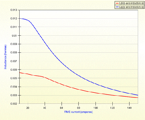 內(nèi)嵌磁鋼式永磁電機(jī)的調(diào)速范圍寬是由于其具有較高的凸極比(d軸電感與q軸電感之比)。MotorSolve能準(zhǔn)確地描述由磁路飽和引起的電感的非線性規(guī)律。上圖表明了Ld 和Lq是電流的函數(shù)。[page]