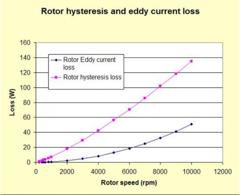 銅損是電機(jī)整體損耗中關(guān)鍵的部分,MotorSolve先進(jìn)的損耗計(jì)算能力能計(jì)算出基于元件級(jí)的磁滯和渦流損耗。上圖表明轉(zhuǎn)子的磁滯和渦流損耗是轉(zhuǎn)速的函數(shù)(或等價(jià)的是頻率的函數(shù))。渦流趨勢呈現(xiàn)拋物線型,而磁滯損耗與功率曲線規(guī)律相似。