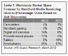 據(jù)IHS iSuppli公司的消費平臺專題報告,憑借多種多樣的功能與特點,智能手機和平板電腦等多用產(chǎn)品將繼續(xù)侵蝕數(shù)碼相機等其它專用消費電子產(chǎn)品的銷售,最終在2015年導(dǎo)致這些傳統(tǒng)的媒體再現(xiàn)(media-rendering)設(shè)備市場永久衰落。