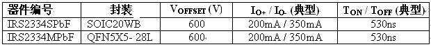 IRS2334SPbF 采用 SOIC20WB 封裝,而 IRS2334MPbF 則以 QFN5X5 封裝供貨,占位面積只有25 mm2 ,并按照合適的爬電與間隙距離要求來設計,確保產(chǎn)品堅固可靠,電壓可高達600V。