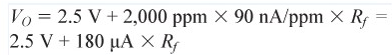 傳感器的最大響應(yīng)為90 nA/ppm,如表2所示,其最大輸入范圍為2,000 ppm.因此,最大輸出電流為180 μA,最大輸出電壓由跨導(dǎo)電阻決定,如公式2所示?!?br />