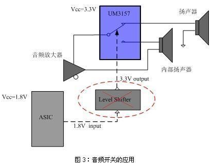 此外,英聯(lián)的低ICCT系列模擬開關(guān)具有更低的VIH電平值,可以使用較低的控制電平實現(xiàn)開關(guān)的高電平切換控制。產(chǎn)品的這種特性大大減少了系統(tǒng)工程師設(shè)計電路的復雜性,特別是在供電電源和控制信號電平不匹配的便攜產(chǎn)品應用中可以免除使用電平轉(zhuǎn)換模塊,從而有效降低了成本。以模擬開關(guān)用來切換音頻信號為例,如圖3所示,可以使用ASIC傳輸過來的1.8V電壓直接來控制UM3157的控制管腳,而不必采用電平轉(zhuǎn)移器也能在實現(xiàn)開關(guān)切換的同時達到很小的漏電流。此外,由于低ICCT模擬開關(guān)不消耗很多功耗(大約1uA),且開關(guān)的導通電阻隨工作電壓的增加而降低,設(shè)計人員可以使用較高的供電電壓來達到更低的導通電阻。對于典型的音頻開關(guān)或USB應用,低的導通電阻是非常重要的。