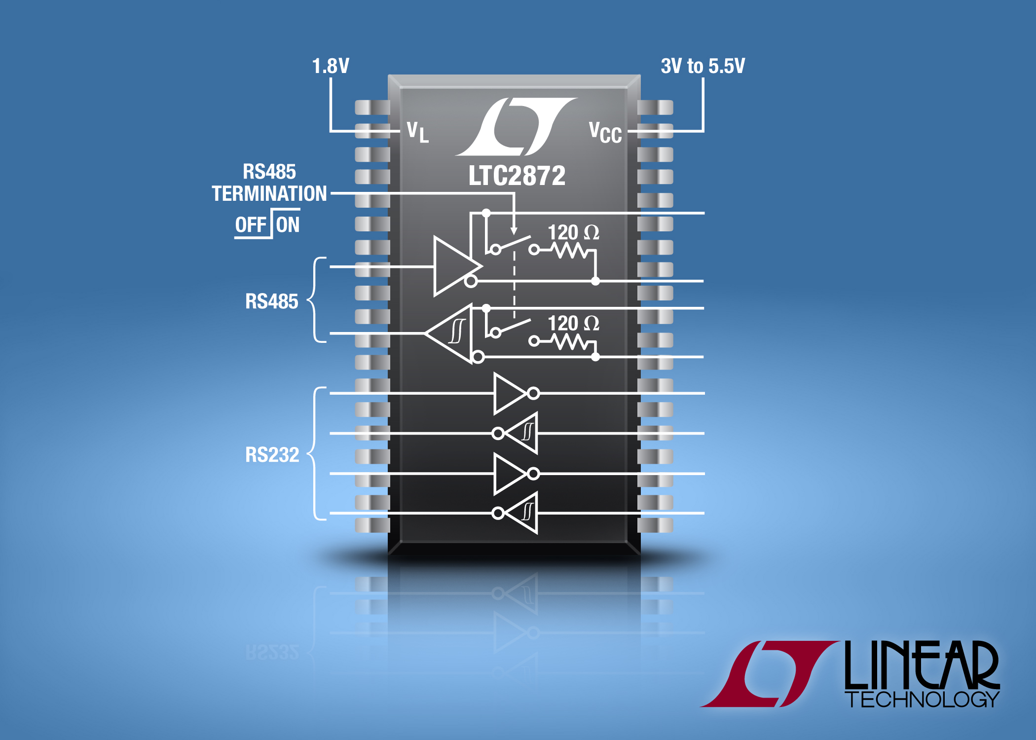 凌力爾特公司 (Linear Technology Corporation) 推出適用于 3.3V 和 5V 系統(tǒng)并具可通斷集成型終端的多協(xié)議收發(fā)器 LTC2872。RS485 系統(tǒng)需要在通信總線的末端上布設(shè)一個終端電阻器,以最大限度地減少信號反射。LTC2872 集成了引腳控制型終端電阻器以簡化接口重新配置,從而免除了外部電阻器和控制繼電器。終端電阻器在啟用時可自動接通或斷開,以與收發(fā)器所選擇的協(xié)議 (RS232 或 RS485) 相匹配。該器件還擁有高 ESD 防護(hù)能力:在收發(fā)器總線引腳上可達(dá) ±16kV HBM (在斷電或運(yùn)作時)。LTC2872 可配置為采用共用 I/O 線路的 4 個 RS232 單端收發(fā)器或 2 個 RS485 差分收發(fā)器,或者此二者的組合,從而減少了多協(xié)議網(wǎng)絡(luò)的組件數(shù)目,并提供運(yùn)行中的可配置性。