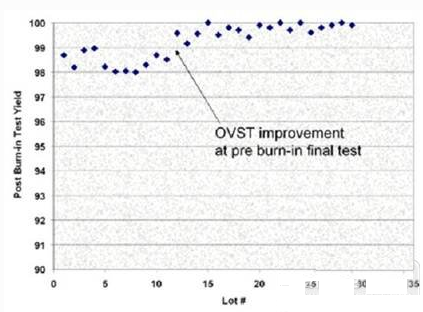 校正措施通常包括:從晶圓制造工藝技術(shù)本身減少缺陷,改進(jìn)自動(dòng)測(cè)試設(shè)備應(yīng)力測(cè)試以提高故障檢測(cè)機(jī)制效率,在工藝上游實(shí)施改進(jìn)的異常值控制以將超負(fù)載試驗(yàn)的結(jié)果提高至100%良率。圖2顯示了根據(jù)逐步量產(chǎn)階段了解到的情況實(shí)施測(cè)試增強(qiáng)以后得到的改進(jìn)的超負(fù)載測(cè)試良率。