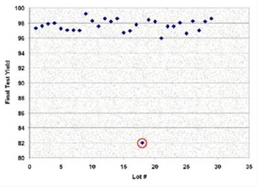 圖4最終測(cè)試良率(超負(fù)載試驗(yàn)前)和標(biāo)出不符合統(tǒng)計(jì)良率限值的點(diǎn)的示例圖。該點(diǎn)是一個(gè)異常值,是要求進(jìn)一步篩選和分析的風(fēng)險(xiǎn)點(diǎn),也可能會(huì)出現(xiàn)不合格品?! ?/p>