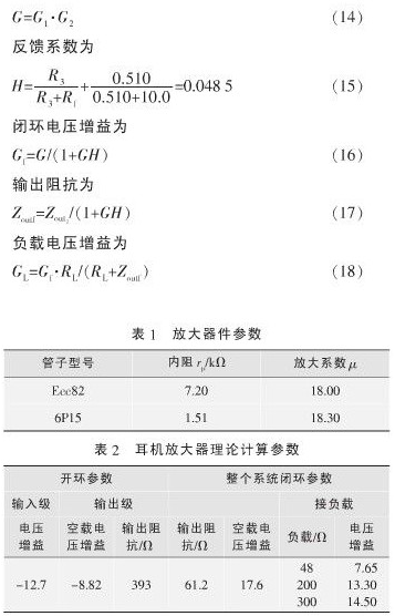 輸入級(jí)放大器件選用Ecc82雙三極管,輸出級(jí)選用6P15,基本參數(shù)如表1所示。為降低輸出阻抗,以便于和阻抗較低的耳機(jī)相匹配,輸出級(jí)SRPP電路采用雙管并聯(lián)的方式工作。放大器的相關(guān)參數(shù)計(jì)算方法如下所示,其中開環(huán)電壓增益為: