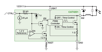 CAV4201和CAT4201是安森美半導(dǎo)體推出的多用途緊湊型降壓LED驅(qū)動(dòng)器,采用專利的均流調(diào)節(jié)架構(gòu),可用24 V驅(qū)動(dòng)多達(dá)7個(gè)串聯(lián)的LED,處理高達(dá)40 V瞬變;其電源效率高于94%,有電流限制、熱保護(hù)及LED開路保護(hù)功能。重要的是,它符合AEC-Q100規(guī)范,除適合MR16燈泡、光條、建筑照明、標(biāo)牌和太陽能照明外,更適合汽車照明應(yīng)用。