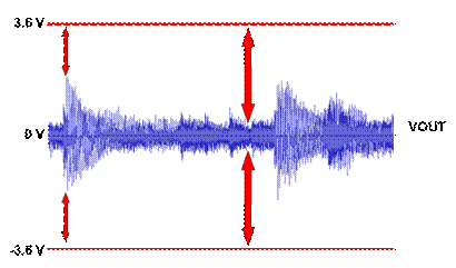 在 AB 類放大器的接地置中架構(gòu)做法中,放大器總是以最高電源電壓運(yùn)作,這表示,對于音頻的無噪聲階段而言,整個(gè)輸出 FET 的電壓降幅相當(dāng)大。以鋰離子電池為例,一般的電池電壓范圍是 3.0V 至 4.2V。假設(shè)電池供應(yīng) 3.6V 的電壓,圖 5 的紅色箭頭表示播放輸出音頻時(shí)整個(gè)輸出 FET 的電壓降幅。
