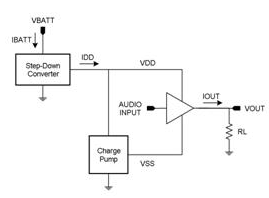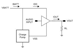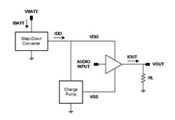 其中的技巧是設(shè)計(jì)將電池電壓降低至較低電壓的放大器,并使用適應(yīng)性電源軌 (分別有負(fù)電源軌) 降低播放音樂時(shí)整個(gè)輸出 FET 的電壓降幅。其中一種實(shí)現(xiàn)這類放大器的方式是,使用電荷泵作為圖 8 所示的步降區(qū)塊。某些工程人員偏好這類做法,原因在于步降電荷泵僅需要相對較小的飛馳電容(flying capacitor) (1μF 至 2.2μF),而這也是相對較小的組件