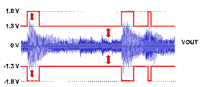 G 類放大器一般使用多個(gè)電源電壓,以發(fā)揮比 AB 類放大器更高的效率。在本例中,TI 最新的 G 類 DirectPath 放大器 (TPA6140A2) 首先將電池電壓降低至較低的電壓值,然后切換至低信號強(qiáng)度的低供應(yīng)電壓 (1.3V),并且只有在信號強(qiáng)度超出該低電源電壓軌時(shí),才切換至較高的電源電壓 (1.8V)。這些適應(yīng)性電源電壓軌的升降速度高于音頻,因此可避免失真或削波。此外,由于一般聆聽的音頻低于 200mVRMS,因此電源電壓通常是最低值 (亦即 1.3V),并且提供優(yōu)于上述 AB 類放大器的效率。在音頻的無噪聲階段期間,整個(gè)電源軌的電壓會降低,而且信號相當(dāng)小。當(dāng)音頻變得大聲時(shí),放大器會切換至較高的電源軌,然后切換回較低的電源軌,導(dǎo)致整個(gè)輸出 FET 的電壓降幅縮小。圖 7 的紅色箭頭表示此電壓降幅。
