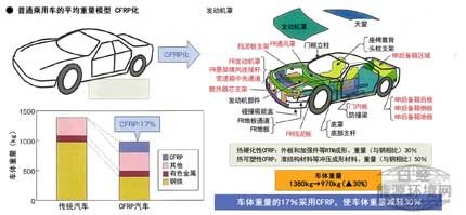 例如,按照碳纖維協(xié)會的推算,普通乘用車的平均車體重量為1380kg,如果盡可能采用CFRP部件,重量大約可以減輕30%,達到97Okg。CFRP的使用量占車體重量的17%左右,約為165kg,這樣一來,如果10年的行駛距離為9.4萬km,二氧化碳排放量可以減少5噸。