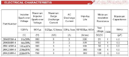 DC spark-over voltage : 定義為以 100V/S 或1000V/S 的上升電壓所測試出來的擊穿電壓叫直流擊穿電壓,一般符合于標稱直流擊電壓的±20%范圍之間;