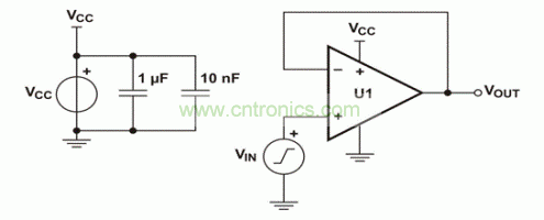 圖 3 用于評估VICMR的單電源電壓跟隨器電路