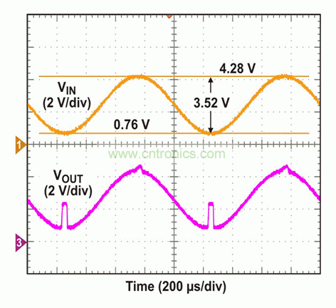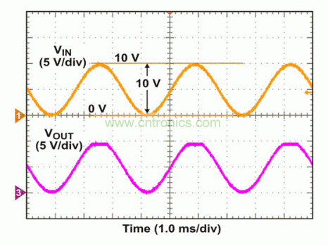 為了測試該電路,我們將VCC/2 = 5V DC偏移的300 Hz正弦波應(yīng)用于輸入端。在VOUT出現(xiàn)變化以前,一直對AC幅值進(jìn)行調(diào)節(jié)。如圖4所示,當(dāng)應(yīng)用10 Vp-p輸入時(shí),VOUT在正軌附近出現(xiàn)一個(gè)經(jīng)削波的信號,而非負(fù)軌附近。如果輸入超出VCC – 0.8V(本例中為9.2V),這種正軌附近出現(xiàn)的非理想行為是我們能夠預(yù)計(jì)到的。9.2V以下VIN電平和低至0V時(shí),VOUT顯示出正確的波形,正如我們所預(yù)期的那樣。