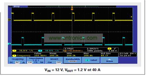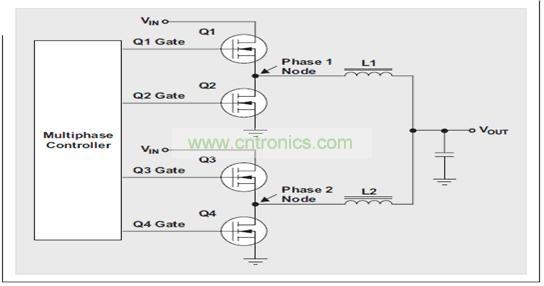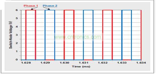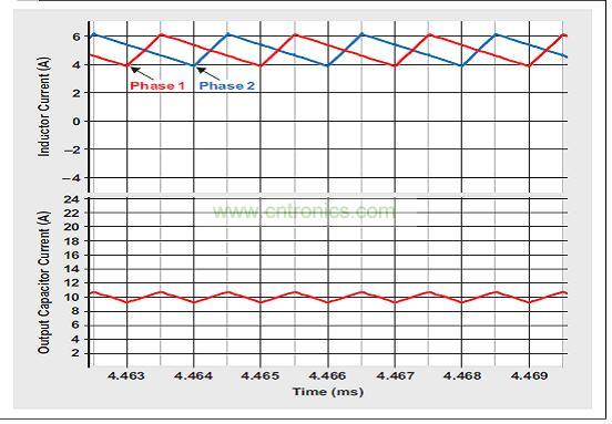 圖1 顯示了一款二相電路。由該電路的波形(圖2 所示)可以清楚地看到各相互相交錯。這種交錯可減少輸入和輸出紋波電流。另外,它還減少了印刷電路板或者某個特定組件上的熱點。實際上,二相降壓轉(zhuǎn)換器讓FET 和電感的RMS-電流功耗降低了一半。相交錯還可以降低傳導(dǎo)損耗。