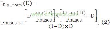 輸出濾波器級中的紋波電流抵消可帶來比單相轉(zhuǎn)換器更低的輸出電容器紋波電壓。這就是多相轉(zhuǎn)換器為什么是首選的原因。方程式1 和方程式2 計算出了每個電感中所抵消的紋波電流百分比。
