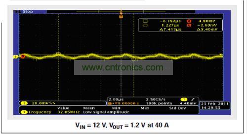 由于每個輸出電感中存儲的能量降低,負載瞬態(tài)性能隨之提高。電流抵消帶來的紋波電壓降低,幫助實現(xiàn)了最小輸出電壓過沖和下沖,因為在環(huán)路響應(yīng)以前許多周期都已結(jié)束。紋波電流越低,干擾越小。