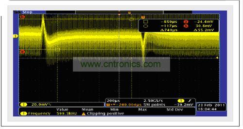 圖10 瞬態(tài)響應(yīng):10-A負載步長20 µs(過沖/下沖約27 mV)