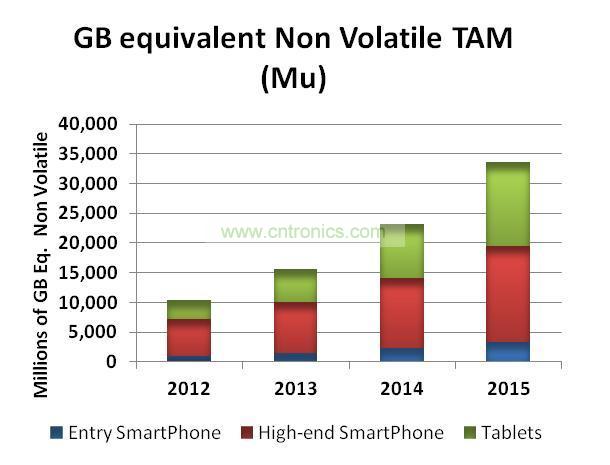 對(duì)于存儲(chǔ)器的市場(chǎng)需求,陶女士預(yù)測(cè),2012年全球半導(dǎo)體市場(chǎng)將達(dá)到$313B,其中DRAM達(dá)到DRAM $32.1B,F(xiàn)lash 達(dá)到$32.4B,這兩塊加起來(lái)占到全球半導(dǎo)體市場(chǎng)的20%以上。非易失性的存儲(chǔ)器將從2012年到2015年一直以直線方式增長(zhǎng)。對(duì)于Entry Smart,目前非常重要的趨勢(shì)是從NAND向e.MMC+LPDDR1/2方向發(fā)展。它的容量是4-8GB e.MMC 疊加 2-4Gb LPDRAM。針對(duì)高端智能機(jī),由于它對(duì)EMC性能的要求更高,所以對(duì)于一些高性能的智能機(jī),容量主要集中在由8/16GB,后續(xù)向64GB e.MMC發(fā)展,現(xiàn)在已經(jīng)出現(xiàn)32GBe.MMC。在平板這一塊,由于它高容量的需求,目前基本上是從16GB一直到將來(lái)的256GB發(fā)展,從2012年趨勢(shì)來(lái)看,將達(dá)到128GB,到2015年,大部分需要達(dá)到256GB。