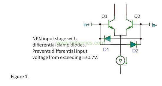 更高電壓(一般大于20V)下工作的JFET 和CMOS 放大器,可能有也可能沒有鉗位。這種不確定性,要求您進(jìn)行更多仔細(xì)的檢查。所用工藝和晶體管類型的特性,決定了其內(nèi)部是否存在鉗位。