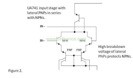 一般而言,雙極NPN 晶體管運(yùn)算放大器都有輸入鉗位,例如:OP07、OPA227 和OPA277 等。uA741 是一個(gè)例外,它具有NPN 輸入晶體管,并且有一些為NPN 提供固有保護(hù)的附加串聯(lián)橫向PNP。