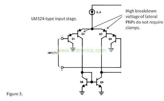 使用橫向PNP 輸入晶體管的通用運(yùn)算放大器一般沒有輸入鉗位,例如:LM324" target="_blank" title="Link to Product Folder">LM324、LM358" target="_blank" title="Link to Product Folder">LM358、OPA234" target="_blank" title="Link to Product Folder">OPA234、OPA2251" target="_blank" title="Link to Product Folder">OPA2251 和OPA244" target="_blank" title="Link to Product Folder">OPA244。這些運(yùn)算放大器一般為“單電源”類型,其意味著它們擁有一個(gè)擴(kuò)展至負(fù)電源端(或者稍低)的共模范圍。輸入偏置電流為一個(gè)負(fù)數(shù)時(shí),表示輸入偏置電流自輸入引腳流出。這時(shí),我們通??梢哉J(rèn)定它們?yōu)檫@類運(yùn)算放大器。但是,需要注意的是,使用PNP 輸入的高速運(yùn)算放大器一般有輸入鉗位,而這些PNP 是一些具有更低擊穿電壓的垂直PNP。