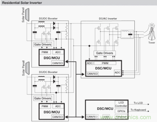 家庭太陽能逆變系統(tǒng)中,飛思卡爾的處理器、微控制器產品,如MC56F84XXX、MC56F82XX、56F803X等等產品,為整個系統(tǒng)帶來可行、高效、可靠的電源轉換方案。
