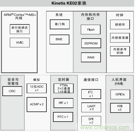 以Kinetis子系列KE02 MCU為例來看。KE02 MCU以ARM Cortex-M0+為內核,該內核以其低功耗特性深獲市場贊譽。KE02也是Kinetis E系列的入門級產品,引腳與整個E系列兼容,擴展靈活,另外,它們還與8位S08P系列兼容。
