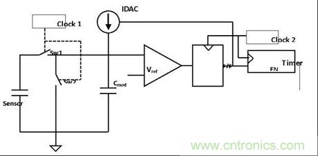 通過在GND和VREF(內(nèi)部生成)之間切換傳感器,只要在器件規(guī)定的工作范圍內(nèi),電源的任何變化都不會造成假觸發(fā)。圖2顯示了傳感器電容在集成電容(Cmod)電壓和GND之間用兩個非重疊時鐘Sw1和Sw2切換時的技術(shù)實施情況。電路比較器的輸出通過觸發(fā)器作為定時器的使能信號,并通過調(diào)節(jié)電源來確保Cmod電壓與參考電壓(Vref)相同。由于輸入端上的任何信號都就n個時鐘周期求積分(n取決于分辨率),因此耦合到輸入端上的任何高頻噪聲都會通過積分效果被平均。