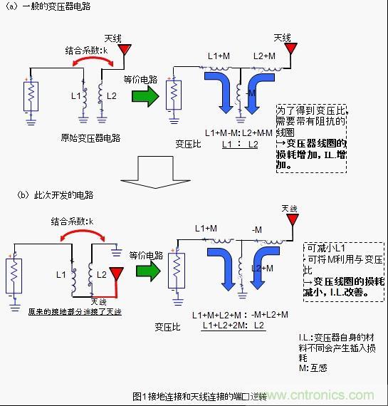 為了削減這種阻抗成分并維持變壓比,我們采用了圖1所示的高頻變壓器的構(gòu)造。該構(gòu)造跟普通的變壓器構(gòu)造相反,它將接地連接端口跟天線連接端口完全逆反。因此,才能達(dá)到如圖1所示的變壓比。使用該構(gòu)造的話,因結(jié)合產(chǎn)生的互感M值會反應(yīng)到變壓器,變壓器中使用的線圈L值會減小,由于高頻變壓器的阻抗成分I.L.可以被抑制得很小。